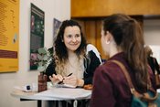 Anschließend konnten sich die Fachtags-Teilnehmenden an Thementischen bzw. online in digitalen Breakout-Räumen zu verschiedenen Fragestellungen austauschen, beispielsweise darüber, wie Beratung sich zwischen digitaler Sicherheit und Selbstbestimmung verorten kann, wie mit Hochrisikofällen im Kontext digitaler Gewalt umgegangen wird oder was es bräuchte, um intersektionalen Aspekten bei digitaler (Ex-) bedarfsgerecht zu begegnen.