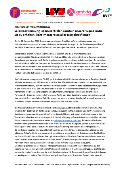 - Link zur Stellungnahme von Frauenhauskoordinierung e. V. zum Gesetzesentwurf über die Selbstbestimmung in Bezug auf den Geschlechtseintrag vom 01.06.2023