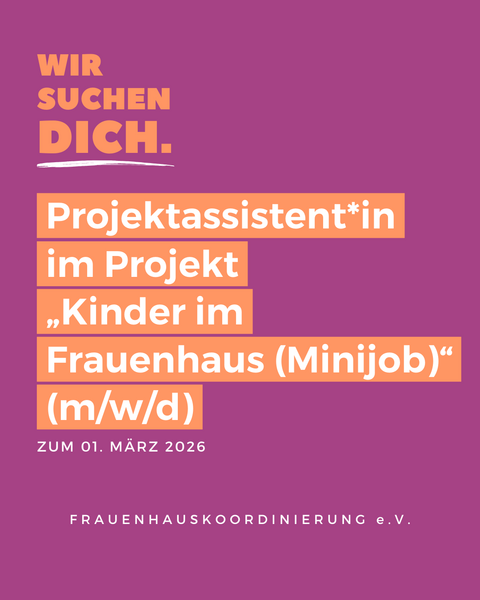Frauenhauskoordinierung e.V. (FHK) sucht zum 1. März 2026 oder zum nächstmöglichen Zeitpunkt eine*n Projektassistent*in zur Mitarbeit in unserer Geschäftsstelle in Berlin Mitte und remote.