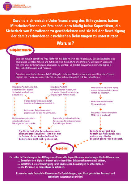 Frauenhäusern und Fachberatungsstellen fehlen vielfach die Kapazitäten, um den Schutz vor digitaler Gewalt im Frauenhaus ausreichend sicherzustellen und die vielfältigen mit der Gewalt verbundenen Belastungen Betroffener zu bearbeiten.