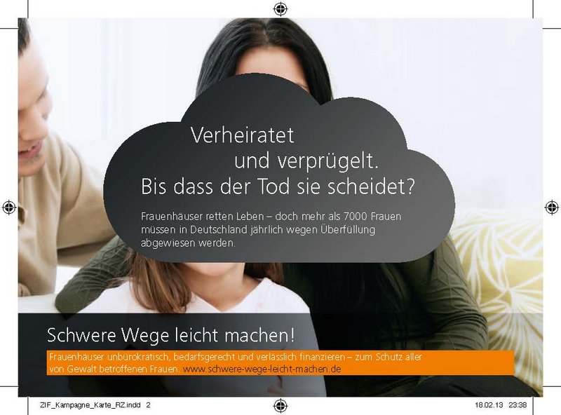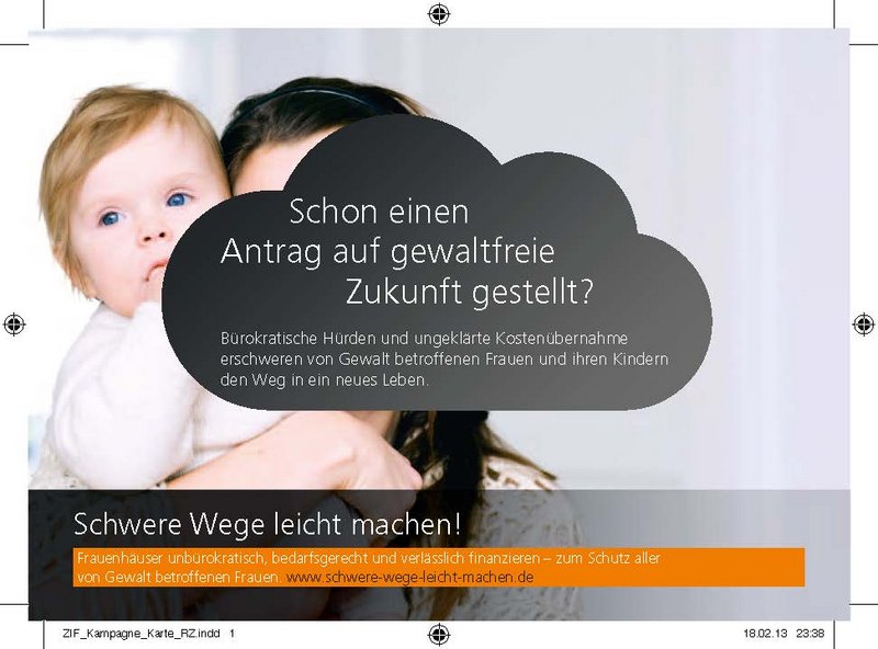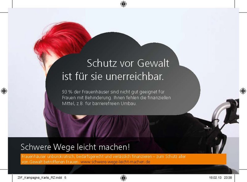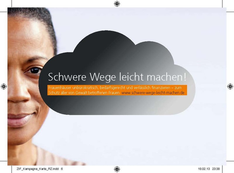 „Schwere Wege leicht machen!“ – unter diesem Titel warb eine Kampagne von Frauenhauskoordinierung und der Zentralen Informationsstelle Autonomer Frauenhäuser (ZIF) bundesweit für einen schnellen und unbürokratischen Zugang zu Schutz und Hilfe für gewaltbetroffene Frauen und ihre Kinder ─ unabhängig von deren Aufenthaltsstatus, Wohnort, Einkommen oder einer Behinderung.